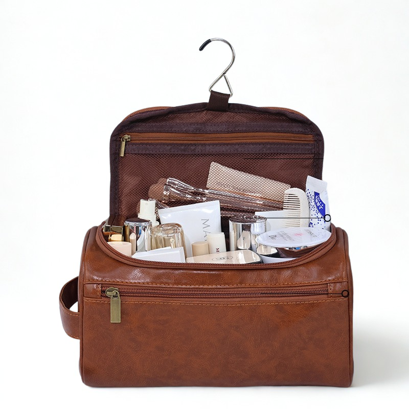 Elegant och slitstark necessär i läderlook med smart hängkrok för enkel upphängning på hotell, gym eller hemma. De många facken håller ordning på allt du behöver – perfekt för resa och vardag. En riktigt billig favorit som gör packningen lättare.