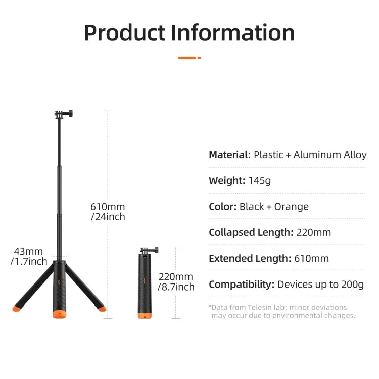 Telesin Flytande Selfiepinne Tripod 220 - 610mm med fäste för GoPro.